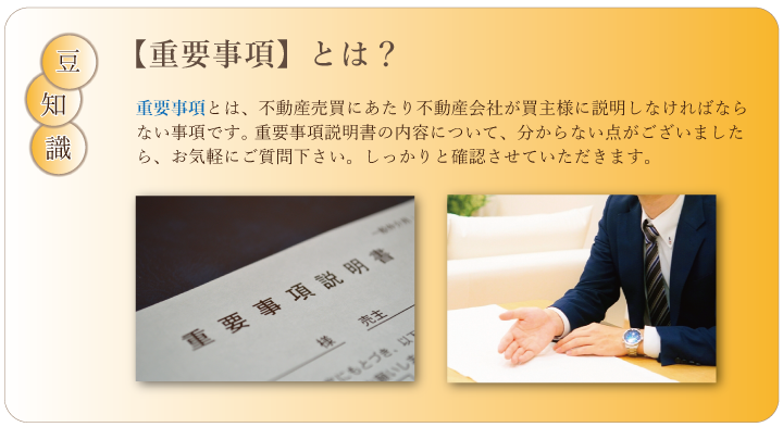 また物件の状態を確認する書類として、物件に付帯する設備(キッチン、給湯器、エアコン、照明器具など)を表す「設備表」、契約時の物件の状況(雨漏りの有無など)を売主様から明確にしてもらう「物件状況など報告書」があります。 これらを踏まえた後、売主様に手付金を支払います。